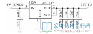 如图所示,U89产生的USB5V供电,经FB31,得到+5V_YUNER,再经U29稳压,得到3V3_TU,用作高频电路的工作供电。