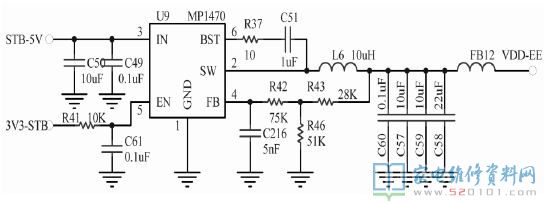 如图所示,U2送来的STB_5V供电经U9(MP1470)为核心的DC-DC变换电路的变换,得到VDD_EE,用作主芯片U13(AML7366-M6C)内核电路的工作供电。