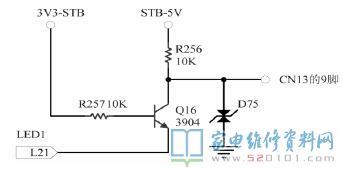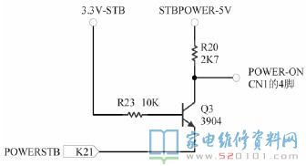 如上图所示,在U13具备工作条件而工作后,其待机控制脚输出POWERSTB开机信号(低电平)到Q3的发射极,Q3导通,Q3集电极输出低电平,此开机信号(POWER_ON)经CN1的④脚送往电源板,使电源电路完全工作,输出12V、24V供电。