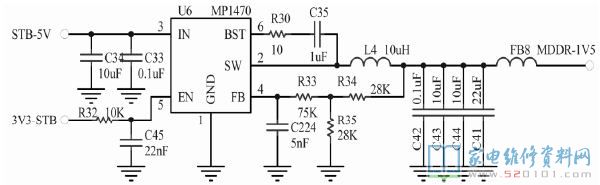如图所示,U2送来的STB_5V供电经U6(MP1470)为核心的DC-DC变换电路的变换,得到MDDR_1V5,用作U14、U15等电路的工作供电。