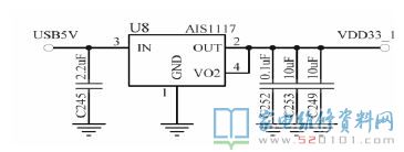 如图所示,USB5V供电经D28,再经U8(AIS-1117)稳压,得到VDD33_1,用作U7的工作供电。