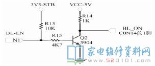 如上图所示,主芯片U13_A(AML7366-M6C)送来的BL_EN背光开关控制信号,经Q2倒相,由CON14的①脚送到背光电路,用于控制背光板电路是否工作(点亮或熄灭背光灯),实际上,本电路为背光电路的使能控制。