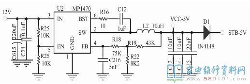 如上图所示,电源板送来的12V供电经U2(MP1470)稳压,得到VCC_5V和STB_5V,用作U3、U6、U9的输入供电。