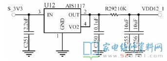 如图所示,VDD33_1供电经U12(AMS1117)稳压,得到AIS-1117,用作U7的工作供电。
