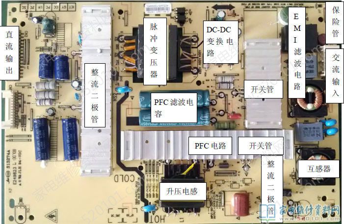 创维168P-P47ELL-03电源板是由保险管、交流输入、互感器、EMI滤波电容、开关管、整流二极管、PFC电路、脉冲变压器、直流输出等模块所构成,其电源板外观如下图所示,本文内容摘自创维E730A(8A12机芯)系列液晶电视维修手册,请下载手册后参考本文内容。