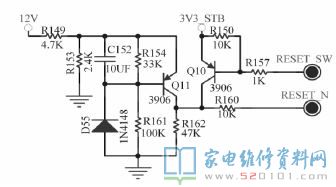 如上图所示,在开机时,主芯片的IO口输出高电平(RESET_SW),三极管Q10截止,对复位电路没有影响,Q11及其外围元件组成的复位电路产生复位电压,给CPU复位。在待机时,主芯片的IO口输出低电平(RESET_SW),三极管Q10导通,CPU复位脚一直为高电平,即不复位。
