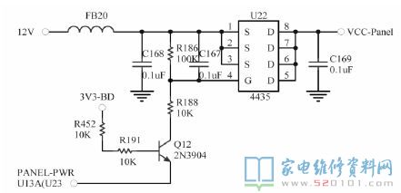 如图所示,当U13_A(AML7366-M6C)送来开机信号(高电平)时,Q12导通,U22的④脚为低电平而导通,12V供电经过U22,输出VCC_Panel供电,用作液晶屏驱动电路的工作供电。