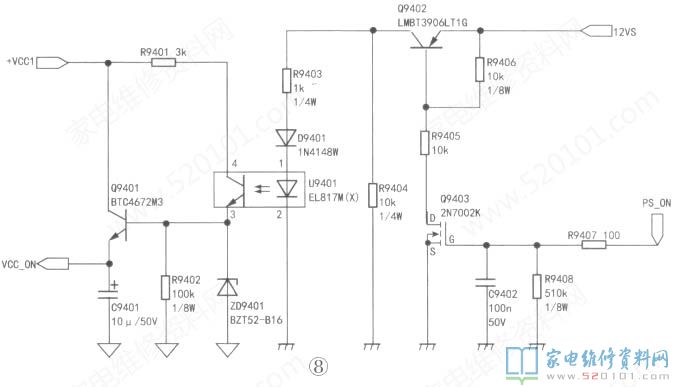 开/待机控制电路由Q9401〜Q9403、U94()1等元件组成,如图8所示。上电后,主电源工作,热地侧输出+VCC1电压(实测值约为18.9V),冷地侧输出12Vs电压,分别加到NPN型三极管Q9401(丝印号:DK)的c极和PNP型三极管Q9402(丝印号:3E)的e极。
