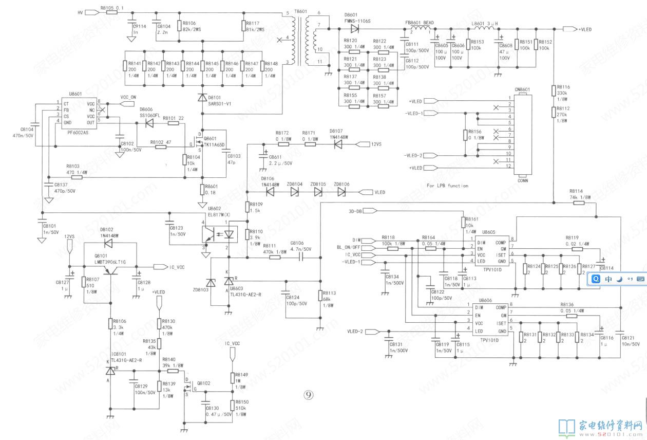 PNP型三极管Q8101(丝印号:2A)与IC8101.Q8102等元件组成ICLVCC电压形成电路。二次开机后,主电源输出的12VS电压(实测值约为12.18V)加到Q8101的e极,+VLED电压经电阻R8130.R8135和R8139分压后,得到约2.56V电压,加到三端精密稳压器IC8101的R极,此时IC8101的K极电压约为1.88V,Q8101的b极电压约为11.42V,Q8101导通,其c极输出IC.VCC电压(实测值约为12.17V),供给恒流控制块U8605、U8606(型号均为TPV101D)③脚。