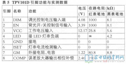 U8605、U8606分别对两组LED灯串的负端电压(-VLED)进行控制,以达到背光亮度调整和稳定LED灯串电流的目的。TPV101D是一款专用于LED背光的恒流控制芯片,内含点灯控制、亮度调整、逻辑控制、升压驱动和欠压锁定等电路,其引脚功能与实测数据见表5。