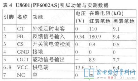 U8601(PF6002AS)是一款具有极低启动电流的绿色模式PWM控制器,其引脚功能与实测数据见表4。
