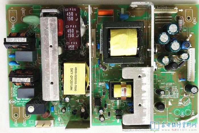 一台创维37L05HR型液晶彩电,上电后红灯亮,但二次不开机。 拆机检查,测得副电源输出的5V电压正 常,但主电源不正常。拆下电源板,用一只1K电阻跨接在5V与QN/OFF端之间,通电,测得大电解电容两端电压为380V说明PFC电路正常;实测主电源输出的12V电压仅2V24V电 压仅4V明显异常。