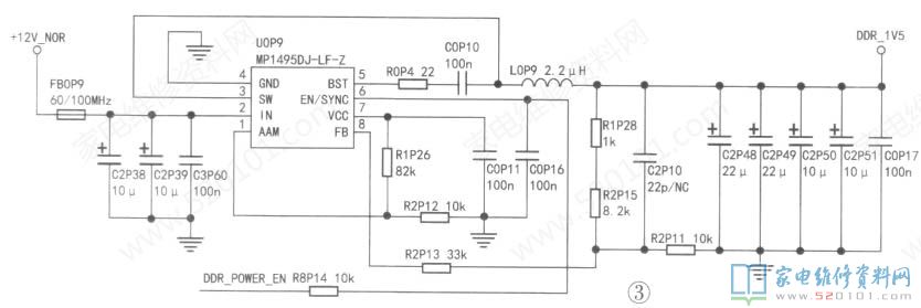 测得U0P2输出3.29V.U2P2输出1.805V,U0P8输出4.97V.U0P10输出1.0V.U1P5输出1.0V,但U0P9输出为0V,不正常。以U0P9为核心的DC-DC电路将输入的12V电压转换成L5V,供给DDR电路,如图3所示。