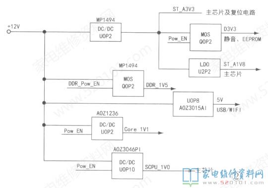 一台创维65E810S型机(9R53机芯),上电后指示灯闪烁,不开机。拆机检查,测得开关电源供给主板的12V电压正常。指示灯闪烁,表明时钟振荡(27MHz)及主芯片A9外接复位电路无故障,怀疑系统程序有问题,或者可能是系统检查主芯片IO端口(主要指主芯片与DDR、eMMC或EEP-ROM电路通讯端口)不成功。根据经验,IO端口自检异常的原因多为供电异常,于是参照该机主板的供电系统(如图2所示)。