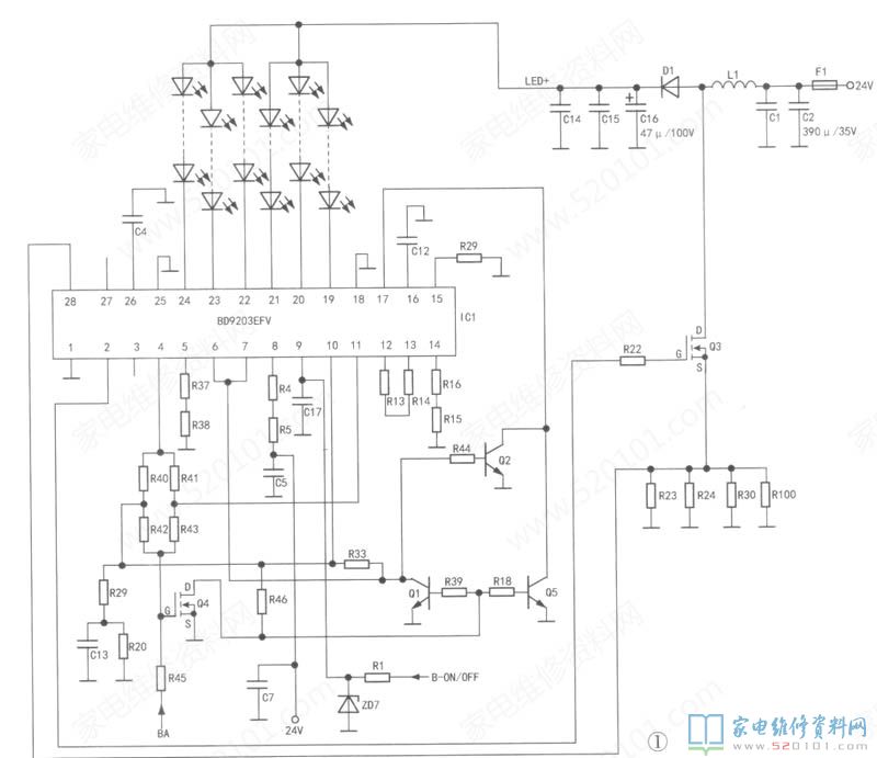 故障现象1:黑屏,伴音正常。分析检修:用手电筒照射屏幕,可看见暗淡的图象,说明背光电路或灯条有故障。上电,测得LED+电压为24V,拔下灯条连线后再开机,LED+电压仍是24V,说明背光驱动电路有问题。测IC1⑧脚供电正常,Q3漏极电压为25V,也正常。但IC⑨脚电压约为0V,明显异常。测主板输出的B-ON/QFF电压正常,怀疑电容C17漏电,将其换新后试机,故障排除。