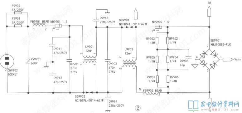 当从插座CN9902输入的交流电压过高时(如有雷电进入),流过压敏电阻RV9901的漏电电流因过压而大增,这时保险F9901、F9902过流熔断,从而避免后级电路过压损坏。L9901.L99O2及外围元件组成两级共模滤波网络,亦称进线抗干扰滤波电路,其作用是淀除通过电网窜入或开关电源产生的共模干扰信号。L9901和L9902是共模线圈,由绕在同一磁环上的匝数相同、绕向相反的两组线圈构成。C9901、C9902常称为X电容,C991LC99里容9914常称为Y电容(又称安全电容)0X电容、Y电容及共模电感的漏感组成不平衡滤波网络,滤除电网或开关电源中的差模干扰信号。