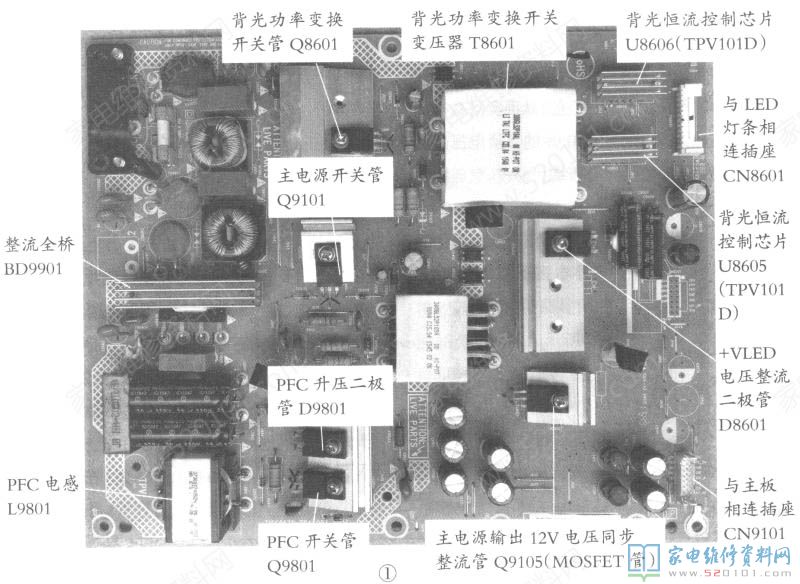 若流过Q98U1的电流增大,其S极对地所接电阻R9801的压降升高,即U9801④脚电压升高,当达到保护阈值时,U9801内部的过流保护电路动作,⑦脚停止输出驱动脉冲,Q9801截止。本文未结束,请继续阅读下一篇《创维715G6679-P04-003-002S电源背光二合一板电路原理分析(中)》