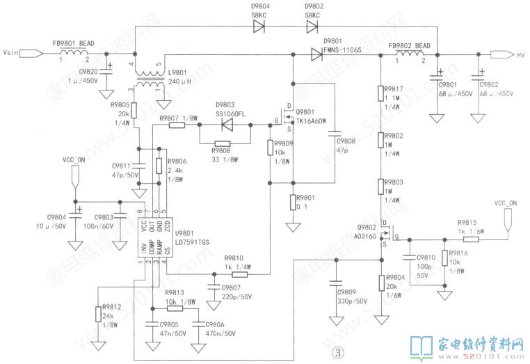 该板采用通嘉公司生产的电压模式PFC控制器LD7591TGS(U9801),如图3所示。