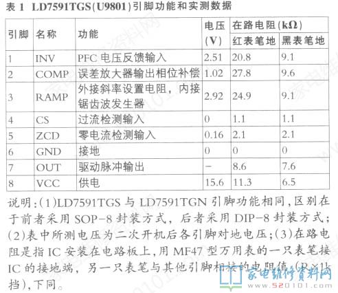 该IC在PFC电路轻载时,工作于间歇模式,其引脚功能与实测数据见表1。