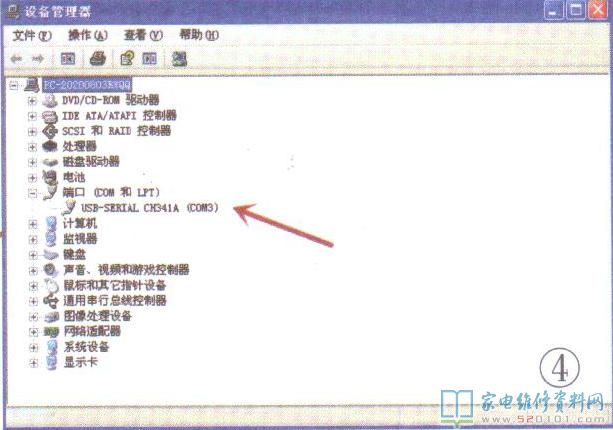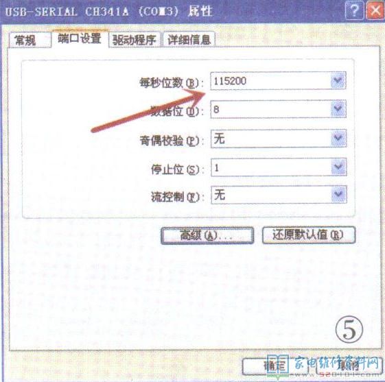(3)安装完成之后,点击“我的电脑”-“设备管理器”- +“端口(COM和LPT)" ,点击“+”号,显示"USB -SERIALCH341A(COM3)"(此处COM3为串口号,对于不同的电脑可能会不同),双击“USB -SERIALCH341A(COM3)",在属性里选择“端口设置”,把串口速率设为“115200”,如图4、图5所示。