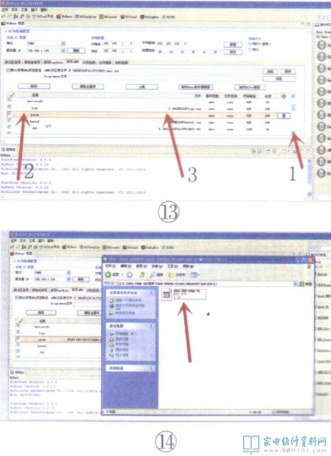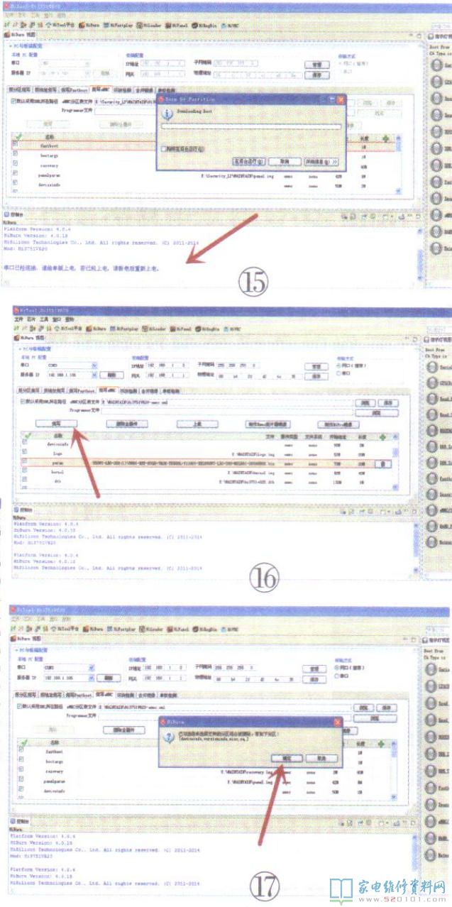 (8)点击“烧写"按钮。若出现提示框,按“确定"按钮即可。将电视机断电后再上电,正常的话,会在机器.上电的时候自动用Hitool进行烧写,如图15~图17所示,界面最下面的消息框中会出现一直增加的“#”字,以显示进度。如果串口或网线传输有问题,则“#”字会变为“T”字,表示超时( timeout)。 选择烧写完所有分区文件,需要十几分钟。