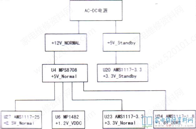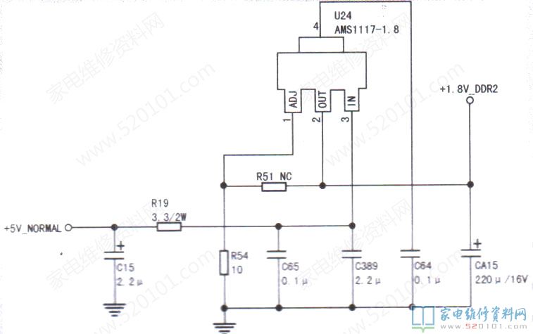 参照该机的供电系统(如图1所示),测量主板上的各组供电,发现U24(AMS1117-1.8)输出电压仅为1.1V,明显异常。该稳压电路如图2所示,测得U24③脚输入的5V正常,怀疑U24损坏。将U24换新后故障排除。