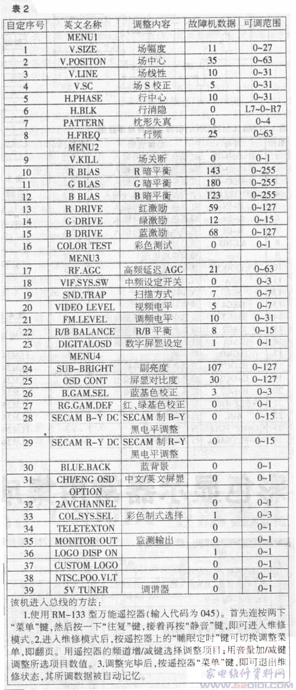 虽说故障原因已初步确定,但笔者却苦于无相关维修资料,加之随机遥控器已丢失,客户配置的是RM-133型万能迢控器,无法进入总线模式。经无数次模拟组合试验,终于得知进入该机总线的方法及数据,见表2。