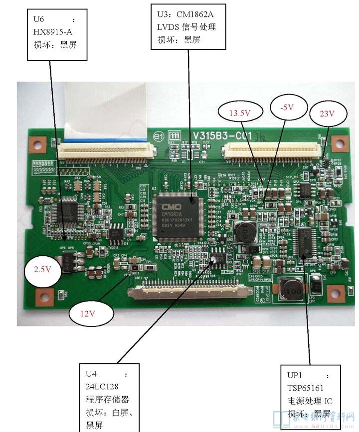 奇美V315B3-C01逻辑驱动板(屏12V供电),配机芯有创维8M19机芯彩电。下图中的该逻辑板的主芯片TPS65161的20、21、22脚为电源输入Vin;此1C与外围电配合可产生几路电压:VGH: 23V VAAP: 13.5V VGL: 负5V VDA: VON: VOFF: VLOGIC: 3.3V 等。