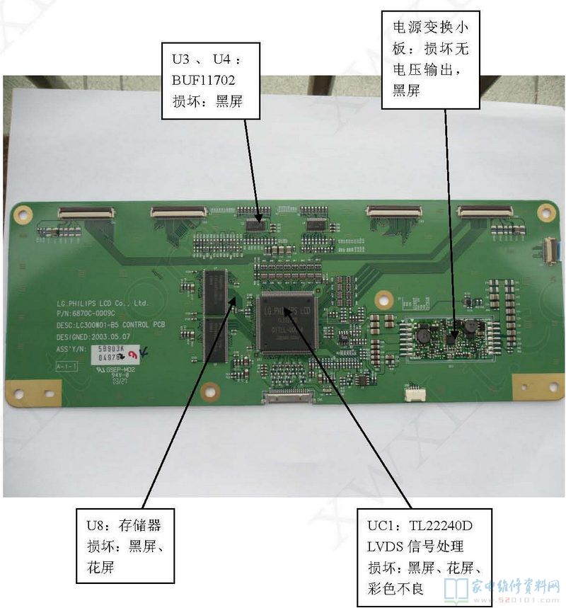30寸LG屏驱动板维修资料(LC300W01-B5) 2017-08-27 00:45:20 阅读 264 次 评论 0 条 摘要: LC300W01-B5 LG屏逻辑驱动板(屏供电12V)常见故障分析如下图所示 LC300W01-B5 LG屏逻辑驱动板(屏供电12V)常见故障分析如下图所示 版权声明:本文为转载文章,版权归原作者所有,欢迎分享本文,转载请保留出处! 点赞 分享: PREVIOUS:30寸LG屏驱动板维修资料(LC3000W01-A3) NEXT:32寸LG屏驱动板维修资料 文章导航