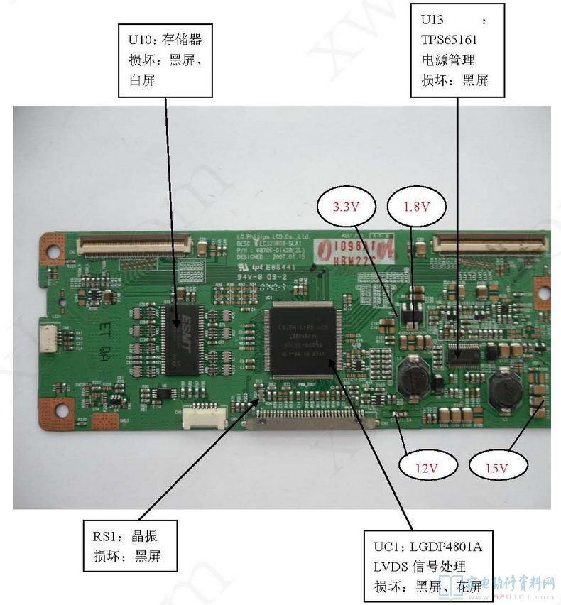 32寸LG屏驱动板维修资料(LC320W01-SLA1) 2017-08-27 20:32:44 阅读 254 次 评论 0 条 摘要: LC320W01-SLA1 LG屏逻辑驱动板(屏供电12V)常见故障分析如下图所示 LC320W01-SLA1 LG屏逻辑驱动板(屏供电12V)常见故障分析如下图所示 版权声明:本文为转载文章,版权归原作者所有,欢迎分享本文,转载请保留出处! 点赞 分享: PREVIOUS:32寸LG屏驱动板维修资料(LC320WX3) NEXT:32寸LG屏驱动板维修资料(LC320WXN-SAA1) 文章导航