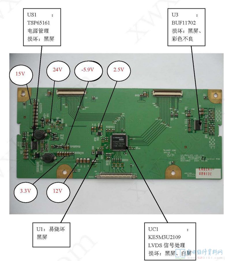 37寸LG屏驱动板维修资料(LC370W01-A5K1) 2017-08-27 21:10:54 阅读 252 次 评论 0 条 摘要: LC370W01-A5K1 LG屏逻辑驱动板(屏供电12V)常见故障分析如下图所示 LC370W01-A5K1 LG屏逻辑驱动板(屏供电12V)常见故障分析如下图所示 版权声明:本文为转载文章,版权归原作者所有,欢迎分享本文,转载请保留出处! 点赞 分享: PREVIOUS:37寸LG屏驱动板维修资料(LC370WX1) NEXT:42寸LG屏驱动板维修资料(LC420WX5-SLA1) 文章导航