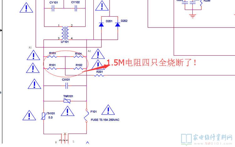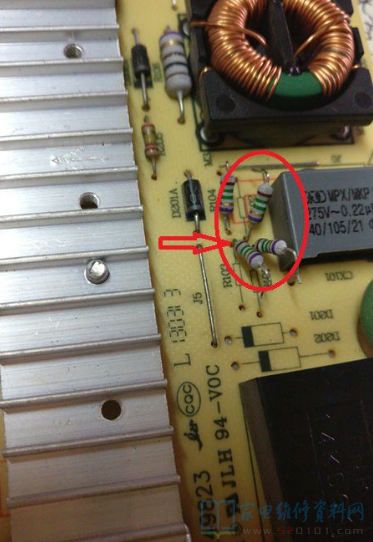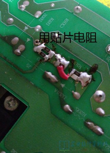 故障检修:拆机上电测电源电容两端+300V正常,看电源芯片是TEA1733P,其1脚本是VCC 15V电压,结果一测电压失踪。断电盲测集成块周围没发现有短路烧坏的元件。只好从1脚电压下手,理电路,发现其电压由四个1.5M的取样电阻取样所出,脱焊一测,四个电阻竞全烧坏,手边只有贴片的1.5M电阻,全部装上试机图声一切正常。