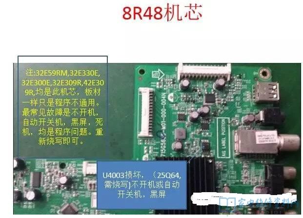一、32E59RM、32E330E、32E300E、32E309R、42E309R均是此机芯,板材一样只是程序不通用,最常见故障是不开机,自动开关机,黑屏,死机,均是程序问题,重新烧写即可。