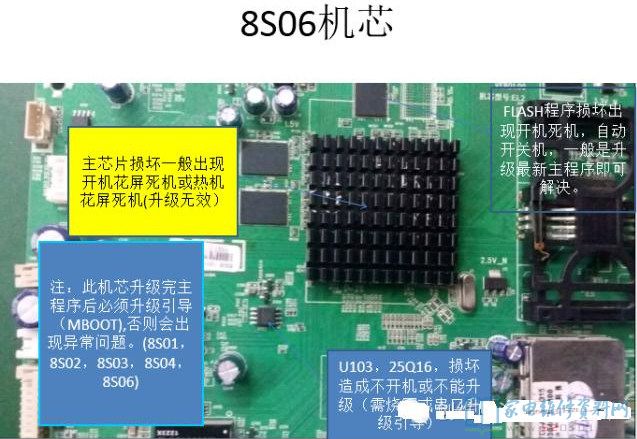 一、主芯片损坏一般出现开机花屏死机或惹急花屏死机(升级无效)注:此机芯升级完主程序后必须升级引导(MBOOT),否则会出现异常问题。(8S01、8S02、8S03、8S04、8S06)