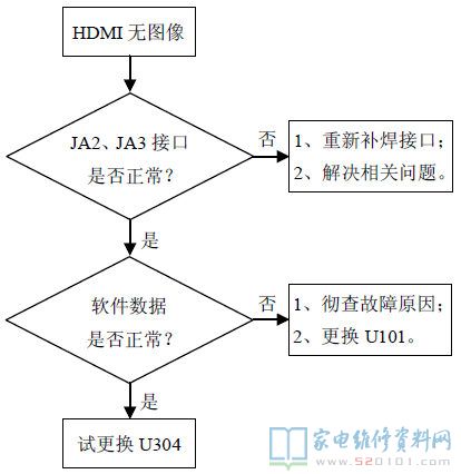 对于本故障,首先输入TV信号看是否有图像,然后检查HDMI插座是否虚焊、供电是否正常,最后考虑是否软件是否存在故障(KEY码、EDID数据是否损坏)。
