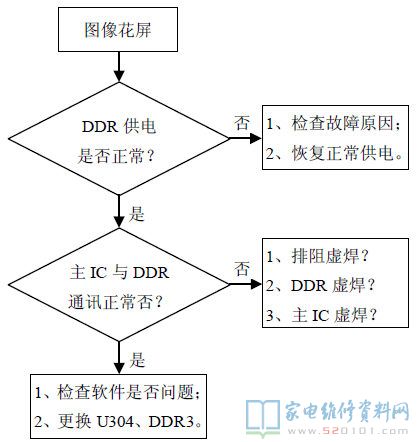 对于本故障,先考虑主芯片与DDR3(U300~U302)通讯是否正常、排阻有无问题、DDR3的供电是否正常、DDR3本身是否损坏等,然后考虑是否软件问题、配屏不对等问题。