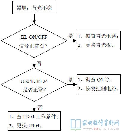 于本故障,先检查背光控制电路电压是否正常。若正常,则背光板坏;若不正常,则主板坏。
