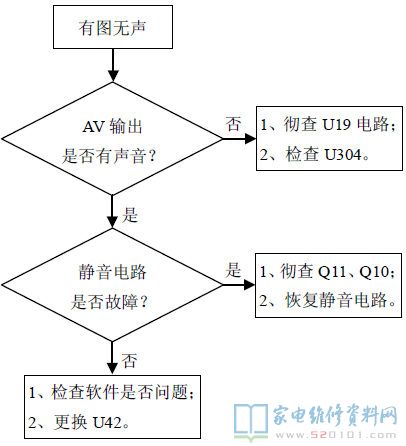 对于本故障,先检查AV输出是否有声音。若AV输出有声音,则可能是功放故障或静音出现问题;若AV输出无声音,则可能是TV通道输入存在问题。