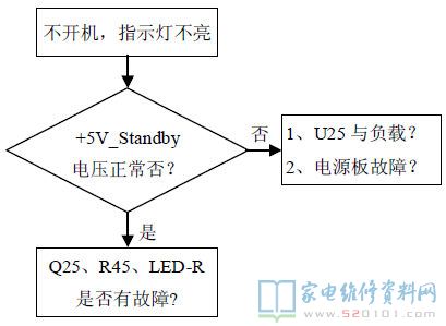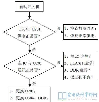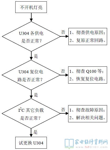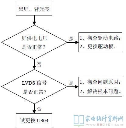 对于本故障,可先测试遥控、键控(若不起作用,则可能为CPU部分故障),后测屏供电电压(若电压不正常,则检查主板电路;若电压正常,则检查驱动板电路),还要注意LVDS线是否松动。