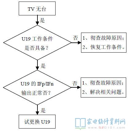对于本故障,首先考虑高频调谐电路、U19的工作条件(供电、总线、16M晶振等)是否正常,然后检查U19到U304之间的通道是否畅通,最后考虑软件是否有问题(进入工厂模式清空EEPROM,看是否正常)。
