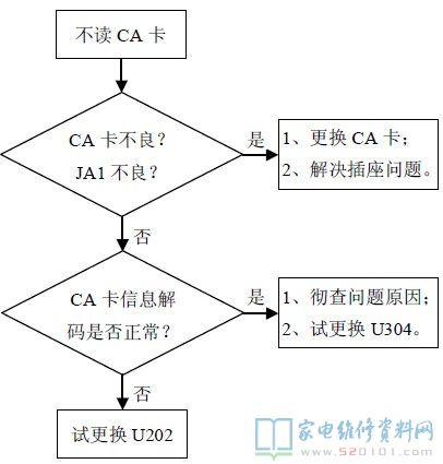 对于本故障,可以先考虑CA卡损坏的问题(如果出现用户没有授权),然后考虑CA卡插口(JA1)是否的接触不良(如果出现一会儿可正常观看,一会儿没有授权),最后考虑CA卡信息解码芯片U202和主芯片U304等故障。