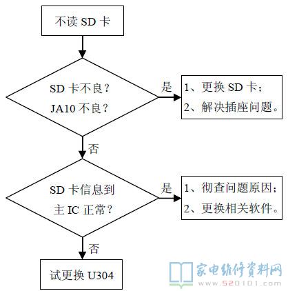 对于本故障,首先考虑SD卡是否损坏,然后考虑SD卡插口(JA10)是否接触不良、供电是否正常,最后考虑SD卡信息到主芯片U304通道是否畅通、主芯片是否故障等。