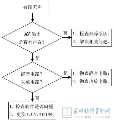 对于“有图无声”故障,检查AV、TV各通道是否都没有声音,然后看看功放U47是否有烧坏,检查功放各供电电路是否正常,接下来考虑静音电路问题,最后考虑更换主芯片U100等。