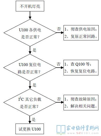 对于“不开机,指示灯亮”故障,考虑主芯片U100中CPU工作条件(供电、复位、总线等)。