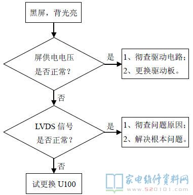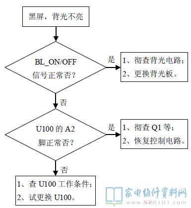 对于“黑屏,背光不亮”故障,先检查背光控制电路电压是否正常。如果正常,那么可判断为背光板坏;如果不正常,那么主板坏。