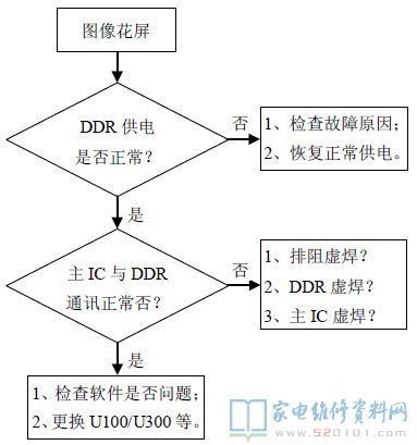 对于“图像花屏”故障,先考虑主芯片与DDR3(U300)通讯是否正常、排阻有无问题、DDR3的供电是否正常、DDR3本身是否损坏等,然后考虑是否软件问题、配屏不对等问题。