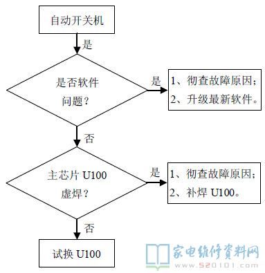 对于“自动开关机”故障,通常有两种情况,一种是开机后立即自动重启,另一种是老化一段时后自动开关机,后一种情况较常见且维修简单(一 般为主芯片热机虚焊造成),前一种情况可能是软件故障或者是主芯片损坏等。