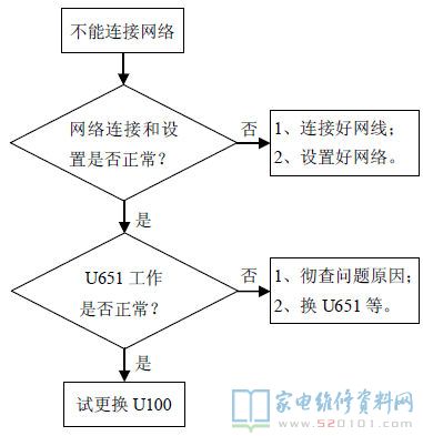对于“不能连接网络”故障,先检查网络是否连接好、设置是否正常,然后考虑隔离变压器U651是否损坏、U651输出到U100通道是否正常(对地有无短路),最后考虑主芯片U100、软件问题。