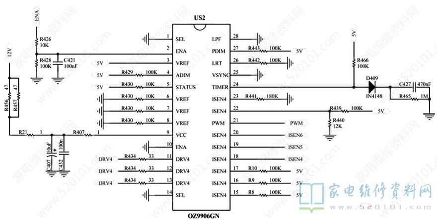这个电源板和恒流板一起的,共有三组灯组,电路也有三个恒流三极管,结果当我去掉三极管射极一个3.9欧电阻后电流由300多毫安降到200多毫安,感觉不尽理想。于是又去掉一个3.9欧电阻,这个时候开机背光就保护了,查阅了一些资料,也没有找出这个28脚OZ9906去保护的资料。于是结合电路分析,感觉这个恒流三极管射极检测电流应该有双重作用,一个是作为灯组是否正常工作,即是作为灯组电流是否正常检测,还有就是电流负反馈。于是通过分析多次试验后,将电流反馈电阻1K改为5K左右背光也不再保护,这样我测试电流差不多100MA左右,放心多了。