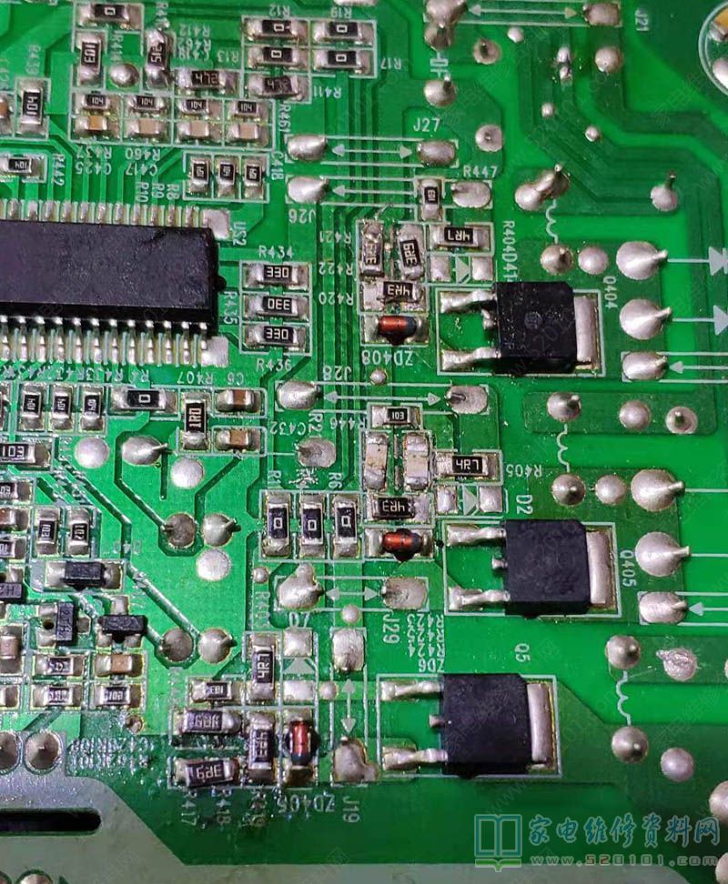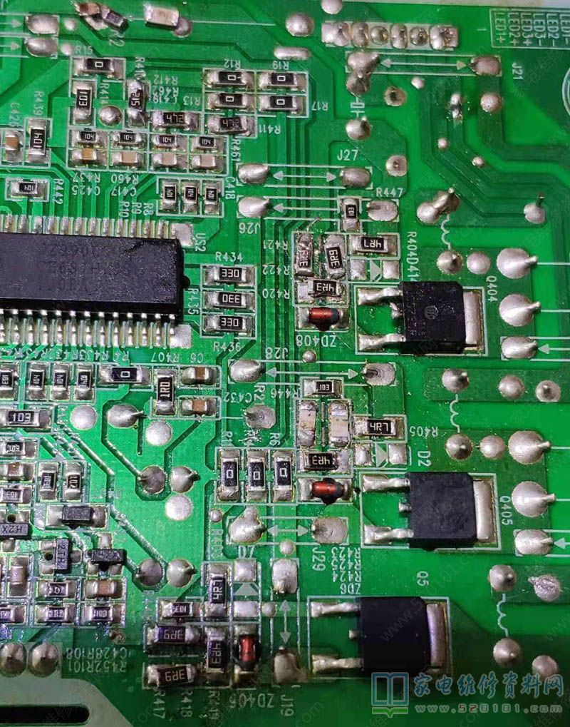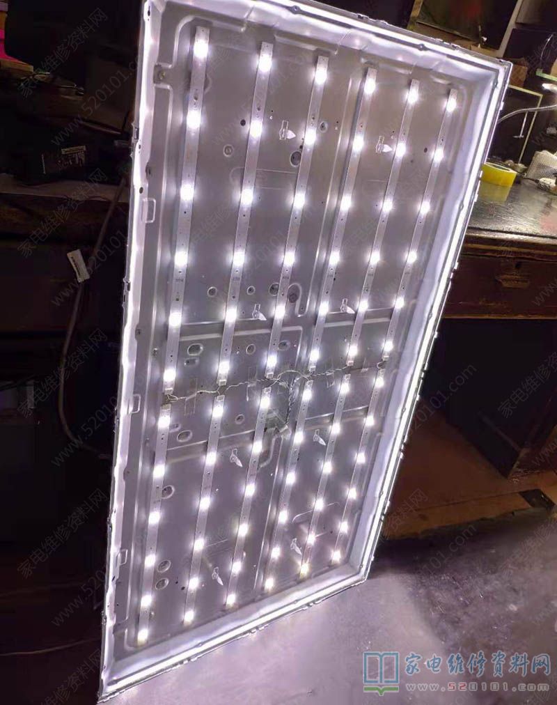 液晶电视,故障表现为开机背光点亮后保护,点亮瞬间观察发现屏幕上部有局部黑的。开机检查发现上面那组灯珠开路,于是拆屏幕,结果发现有一组灯珠坏了一个,别的灯珠没有发黑现象。于是更换坏的灯珠,电视机修复,不过为了稳妥起见,决定将背光电流改小点。